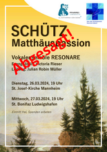 Das Vokalensemble „Resonare“ führt die Matthäus-Passion von Heinrich Schütz auf. Das junge Ensemble, das von Julian Robert Müller geleitet wird, besteht aus Studierenden der Musikhochschule Mannheim und Sängern aus deren Umkreis.